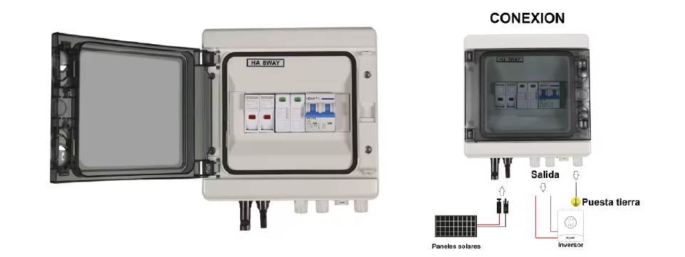La PV Combiner Box 1 en 1 hasta 600V es una caja combinadora solar diseñada para unificar la salida de una cadena de paneles fotovoltaicos y enviarla de forma segura hacia el inversor. Fabricada para instalaciones residenciales y comerciales pequeñas, ofrece protección completa mediante portafusible de 15A, disyuntor DC de 2 polos y un SPD de 20–40KA.
